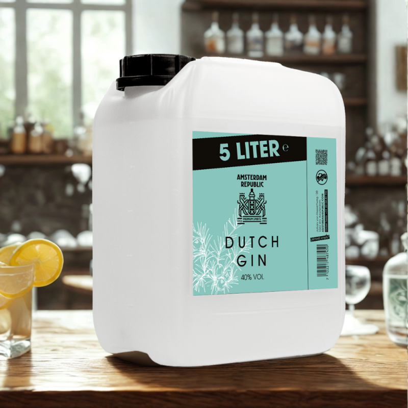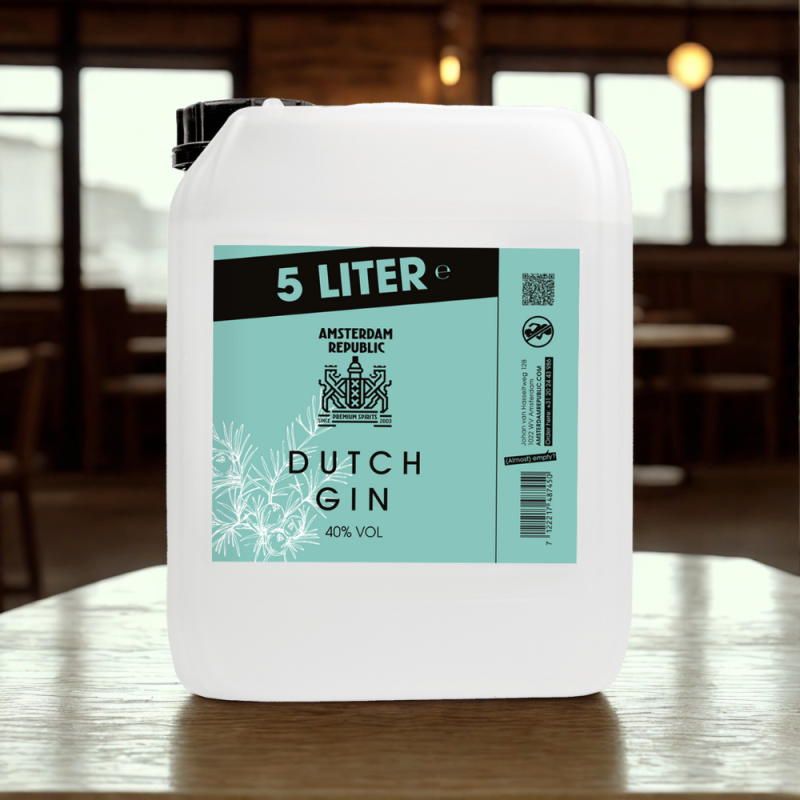 Deze 5-liter jerrycan is gemaakt voor momenten waarop één fles gewoon niet genoeg is. Binnenin vind je onze Premium Amsterdam Gin – helder, aromatisch en vol karakter.