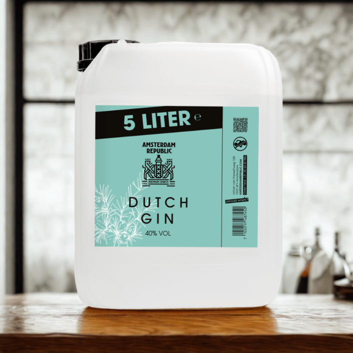 Deze 5-liter jerrycan is gemaakt voor momenten waarop één fles gewoon niet genoeg is. Binnenin vind je onze Premium Amsterdam Gin – helder, aromatisch en vol karakter.