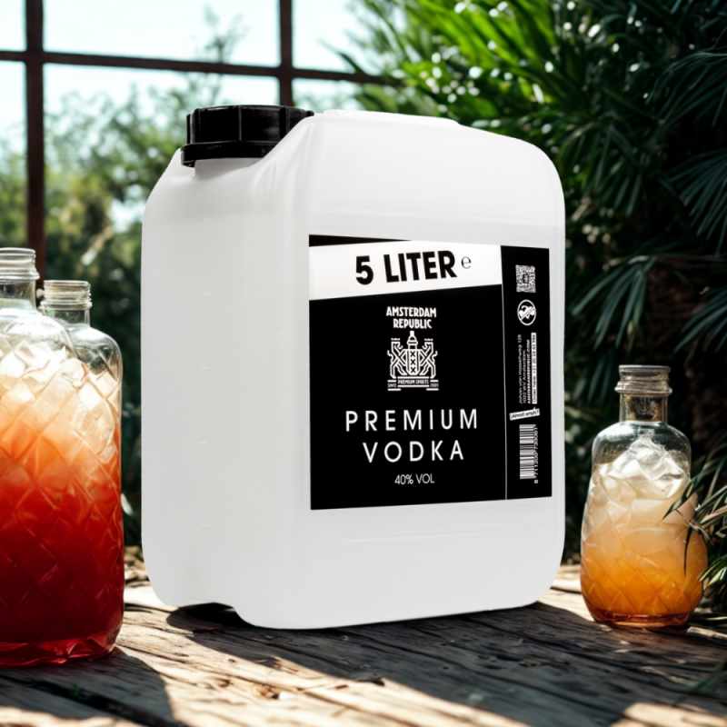 Vijf liter pure, Amsterdamse vodka van biologisch graan en kristalhelder water – zacht, clean en perfect voor cocktails. Ideaal voor kroegen, events en feestjes waar de flessen te snel leeg zijn.